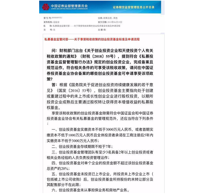6月19日,證監(jiān)會(huì)發(fā)布了與“財(cái)稅55號(hào)文”有關(guān)的《私募基金監(jiān)管問答——關(guān)于享受稅收政策的創(chuàng)業(yè)投資基金標(biāo)準(zhǔn)及申請(qǐng)流程》,明確了可申請(qǐng)享受該優(yōu)惠政策的創(chuàng)投基金所應(yīng)該具備的條件。