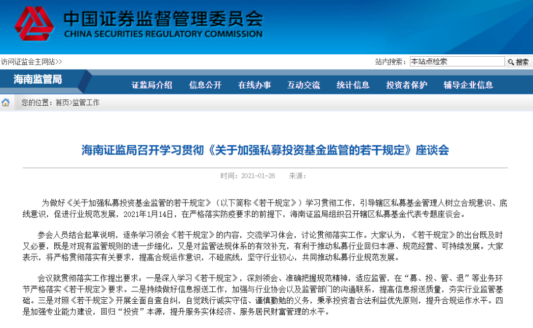1月26日,海南證監(jiān)局發(fā)布消息稱,已于1月14日組織召開轄區(qū)私募基金代表專題座談會,深入學習《規(guī)定》內容,下一步將對照《規(guī)定》開展全面自查自糾。